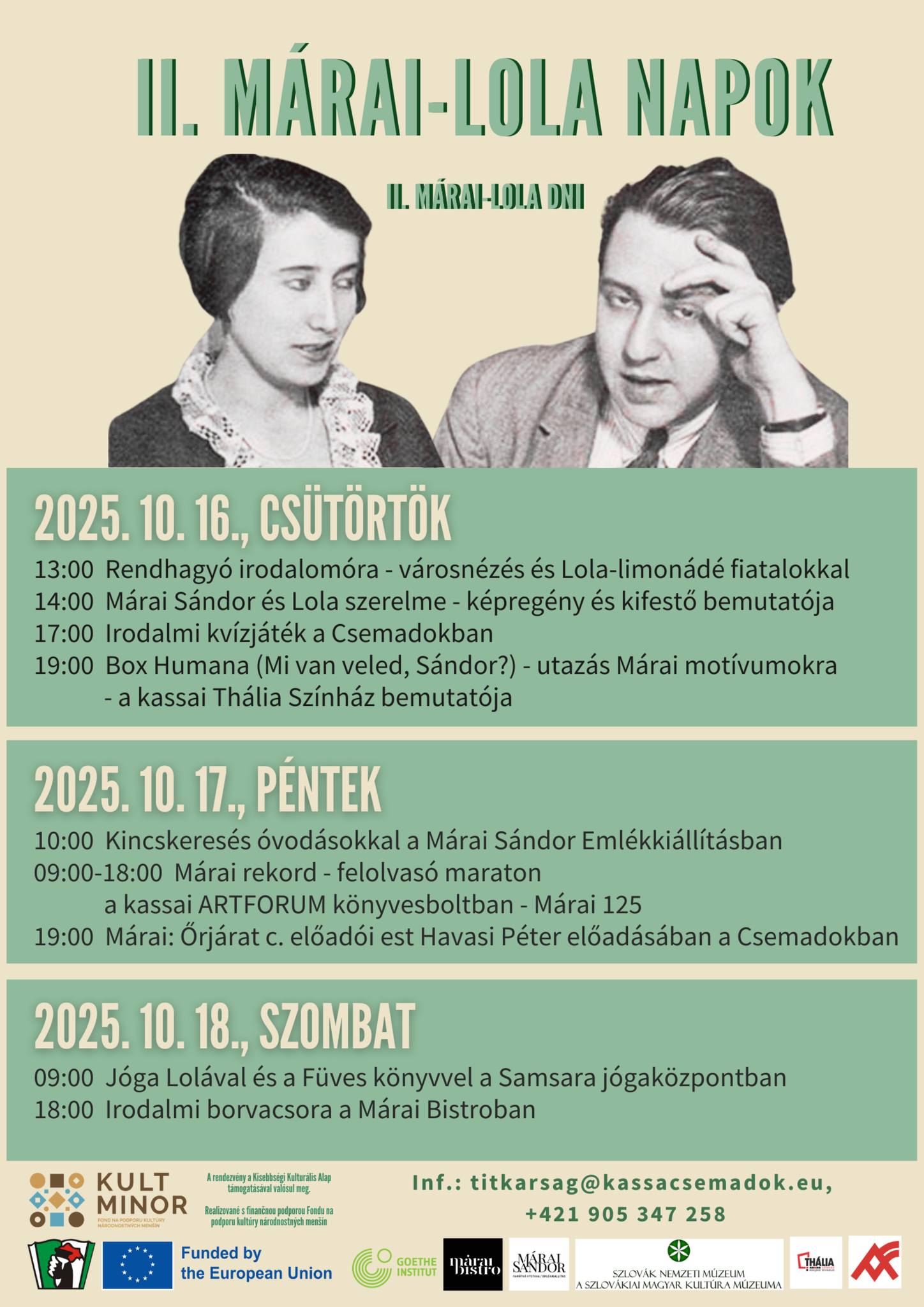 A második Márai-Lola Napokat október 16-18-án szervezi meg a Csemadok Kassai Városi Választmánya. „Akárcsak tavaly, az idén is sok-sok színes programmal készülünk, amelyek témái szintén szorosan kapcsolódnak Kassa világhírű szülötte, Márai Sándor és felesége, Matzner Lola hétköznapi életének apró történéseihez, meghatározó mozzanataihoz” – tájékoztatták portálunkat a szervezők.