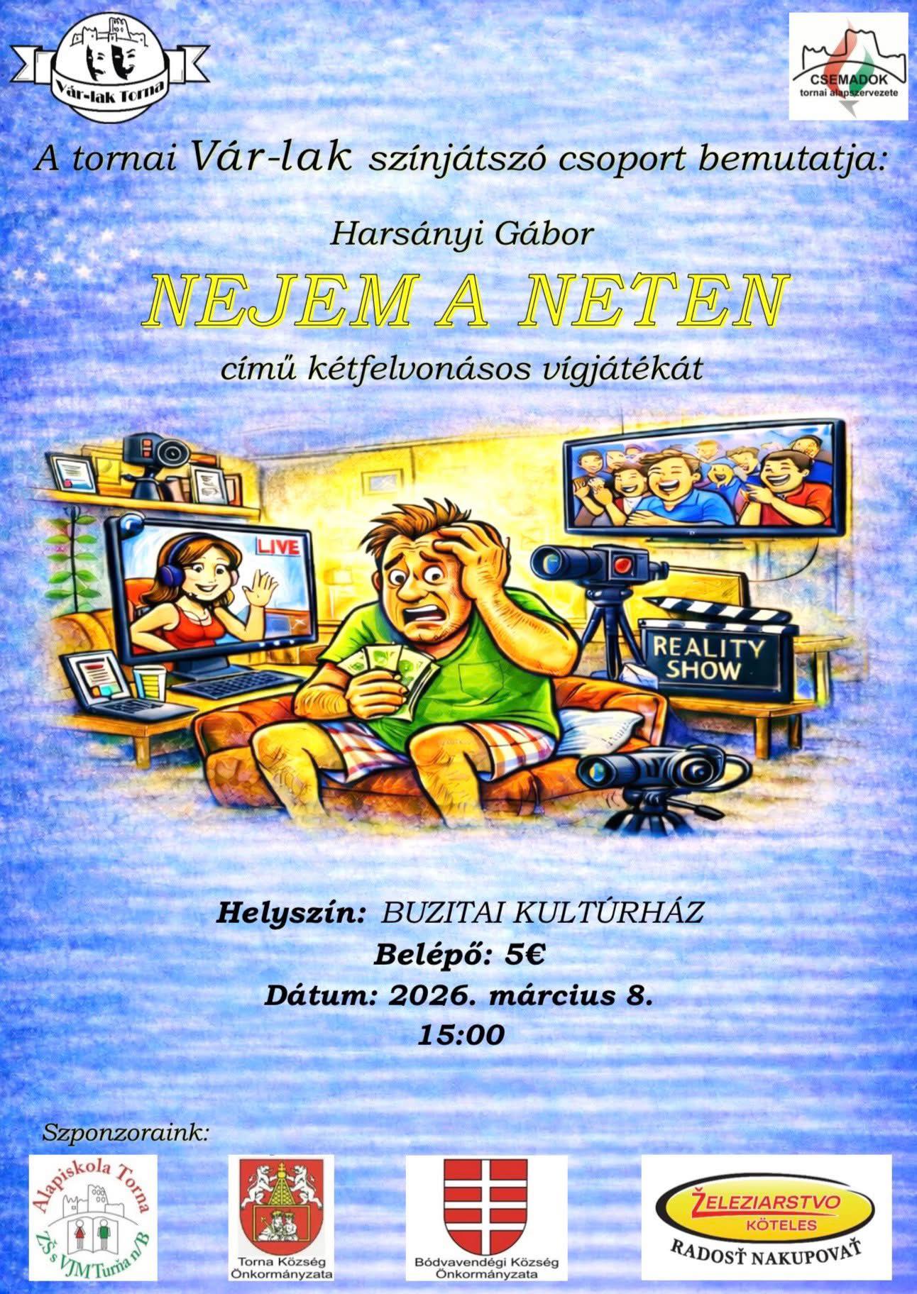 A tornai Vár-lak színjátszó csoport 2026. március 8-án, vasárnap délután 15:00 órától a buzitai kultúrházban mutatja be Harsányi Gábor Nejem a neten című kétfelvonásos vígjátékát.