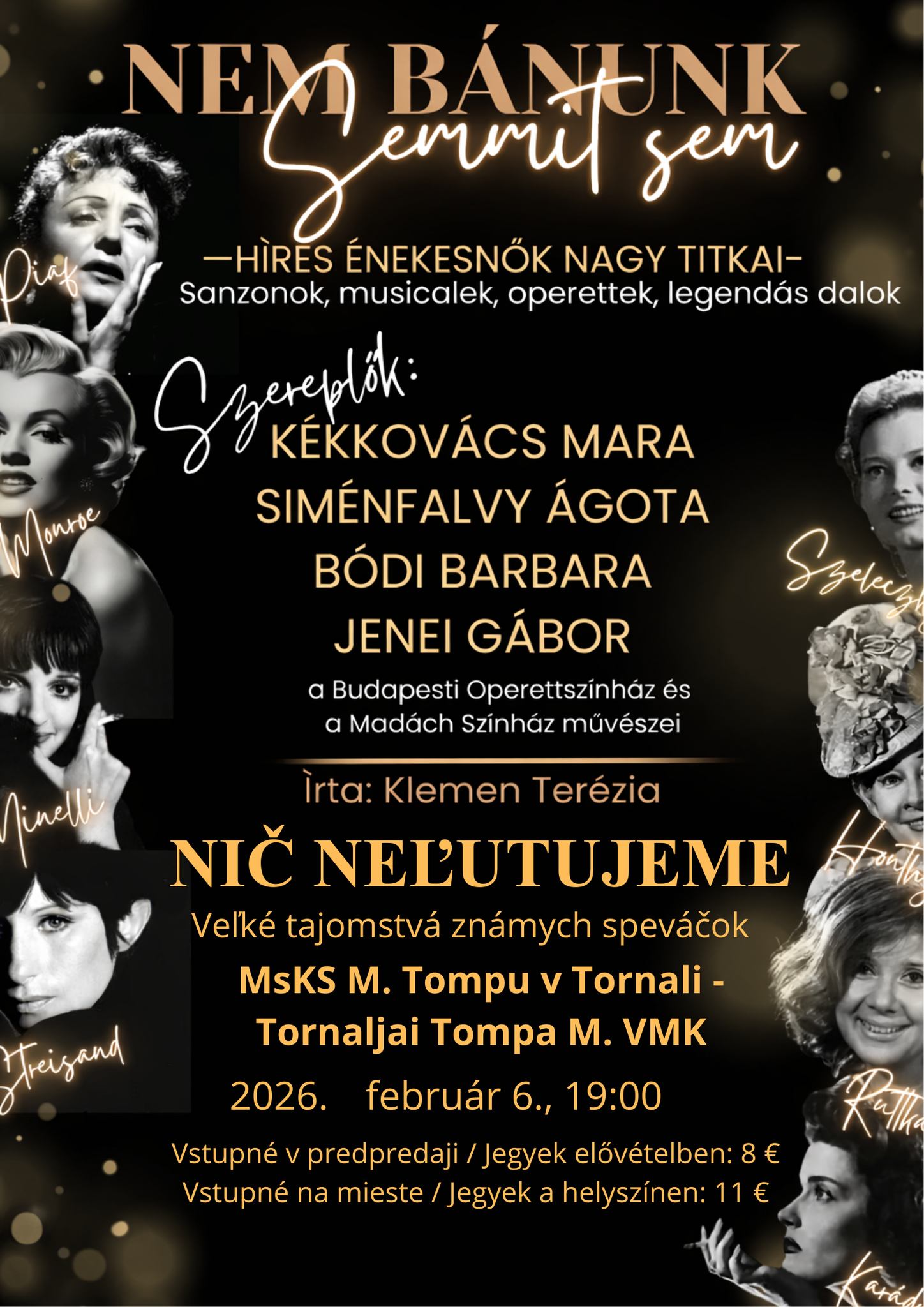 Híres énekesnők nagy titkai tárulnak fel a zenés műsorban, melyre február 6-án, pénteken 19:00 órától, a Tornaljai Tompa Mihály Városi Művelődési Központban kerül sor.