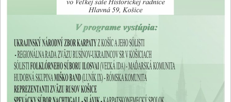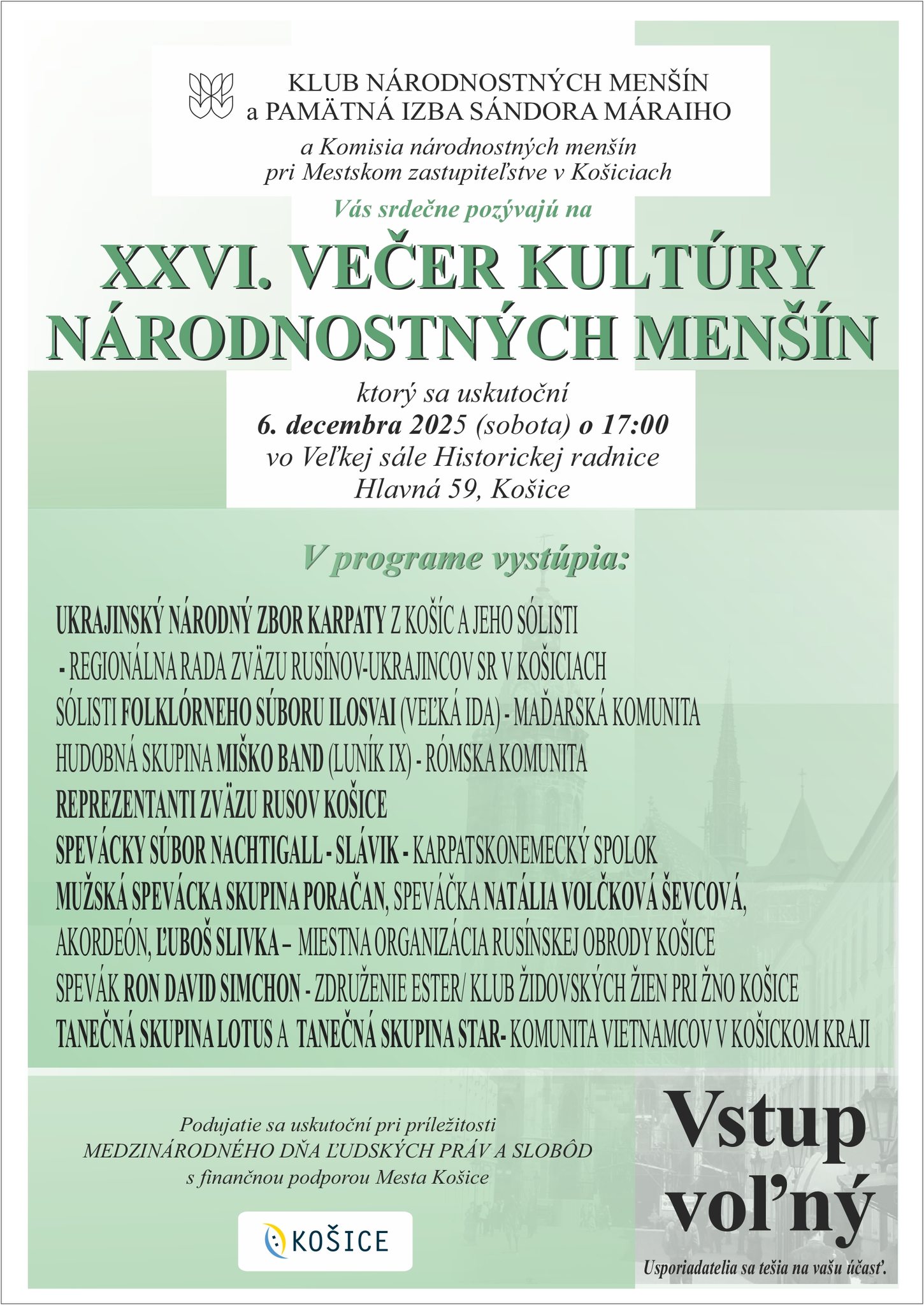 A Nemzeti Kisebbségek Klubja, a Márai Sándor Emlékszoba és Kassa város Nemzeti Kisebbségek Bizottsága meghívja az érdeklődőket a nemzetiségek közös kulturális estjére, melyre 2025. december 6-án (szombaton) 17:00 órakor kerül sor a kassai történelmi városháza nagytermében (Fő utca 59. szám – régi Slovan mozi).