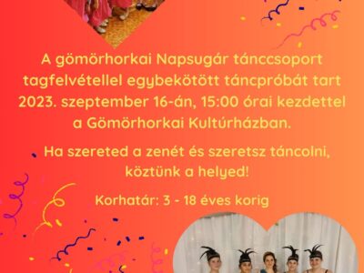 A Napsugár tánccsoport tagfelvétellel egybekötött táncpróbát tart 2023. szeptember 16-án 15:00 órától a gömörhorkai kultúrházban. Rozsnyó-vidék
