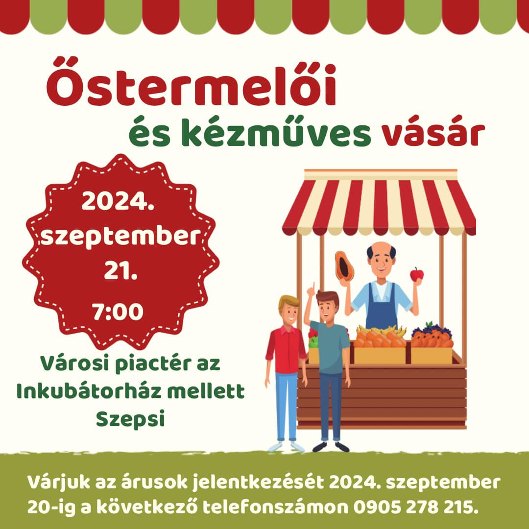 Szeptember 21-én, szombaton reggel 7:00 órától ismét őstermelői és kézműves vásárt tartanak a szepsi Inkubátorház melletti városi piactéren.