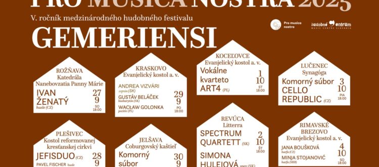 A Pro Musica Nostra Gemeriensi elnevezésű népszerű fesztivál idén ősszel immár ötödik alkalommal kerül megrendezésre a gömöri, nógrádi és kishonti régióban. Szeptember 27-től október 4-ig számos építészeti emlékünkben elevenedik meg a komolyzene neves hazai és külföldi előadók, együttesek tolmácsolásában.