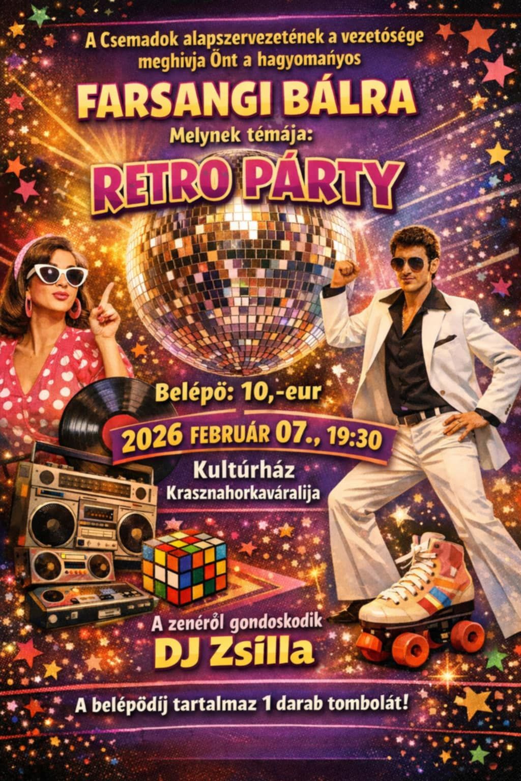 A Csemadok Krasznahorkaváraljai Alapszervezetének vezetősége 2026. február 7-én, szombaton rendezi meg hagyományos farsangi bálját, melynek témája idén is a retro party. A buli 19:30-kor kezdődik a kultúrházban, a jó hangulat és a régi slágerek mellé retro öltözet ajánlott.