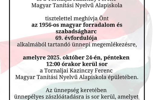 A CSEMADOK Tornaljai Területi Választmánya és a Tornaljai Kazinczy Ferenc Magyar Tanítási Nyelvű Alapiskola ünnepi megemlékezést szervez az 1956-os magyar forradalom és szabadságharc 69. évfordulója alkalmából.
