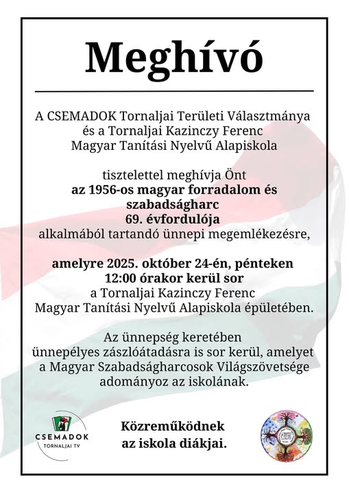 A CSEMADOK Tornaljai Területi Választmánya és a Tornaljai Kazinczy Ferenc Magyar Tanítási Nyelvű Alapiskola ünnepi megemlékezést szervez az 1956-os magyar forradalom és szabadságharc 69. évfordulója alkalmából.