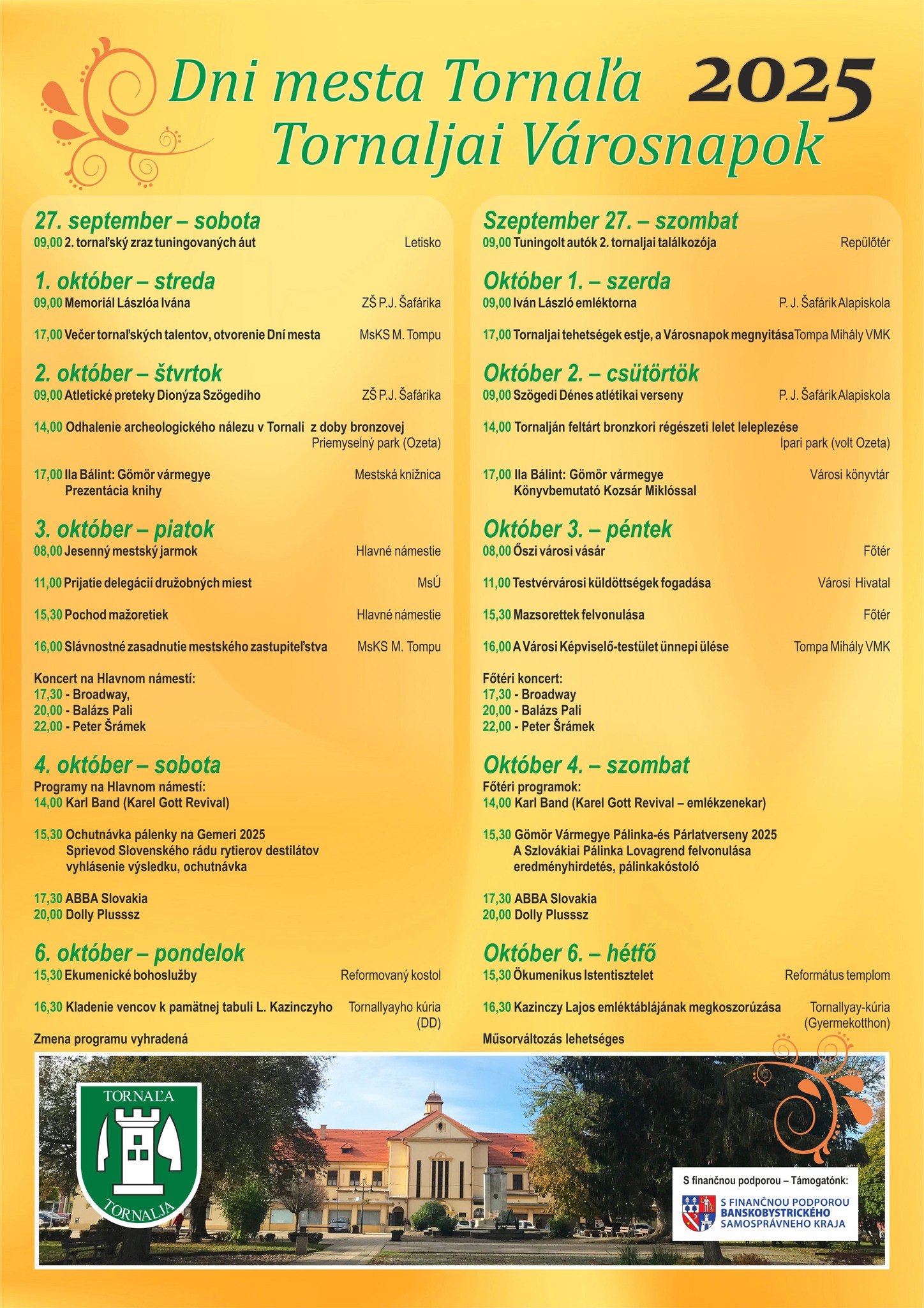 Október 6-án (hétfőn) 15:30-tól a CSEMADOK Tornaljai Területi Választmánya, a Rákóczi Szövetség helyi szervezete és Tornalja Város Önkormányzata ünnepi megemlékezést rendez az aradi vértanúk napja alkalmából a református templomban.