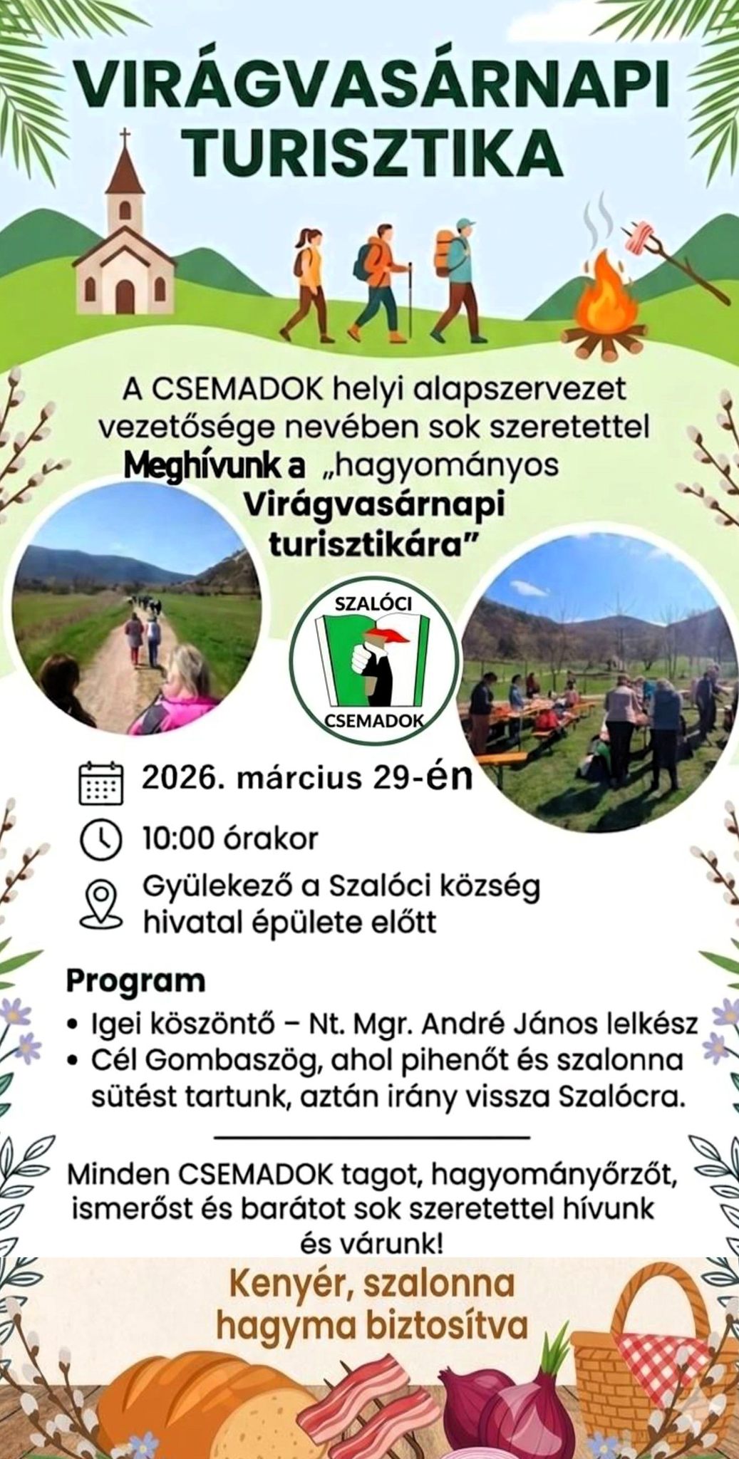 A Csemadok Szalóci Alapszervezetének vezetősége 2026. március 29-én szervezi meg a hagyományos virágvasárnapi túrát.