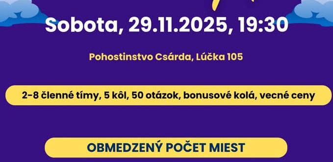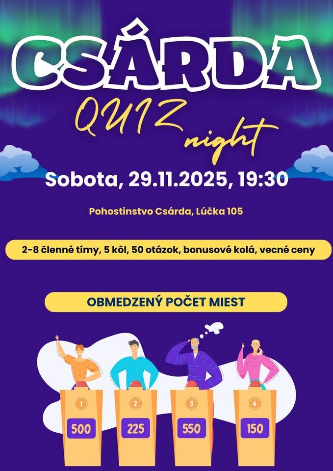 November 29-én, szombaton 19:30-tól az idei tizenegyedik kvízestre várják a versenyezni vágyó csapatokat a lucskai Csárda vendéglőben. A játékot ezúttal is Nano kvízmester vezeti.